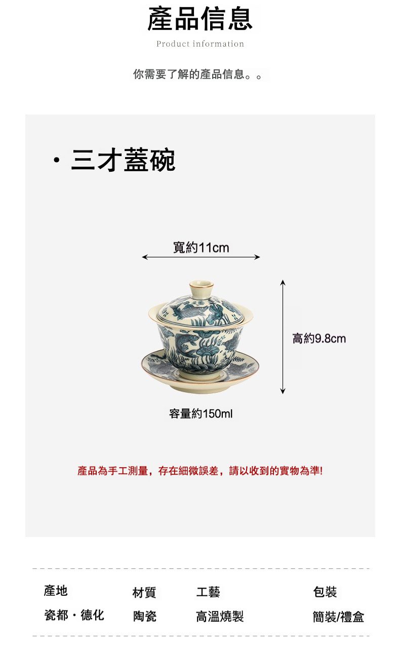 | 規格 | 魚藻紋三才蓋碗, 魚藻紋三才蓋碗 ( 禮盒裝 ) |