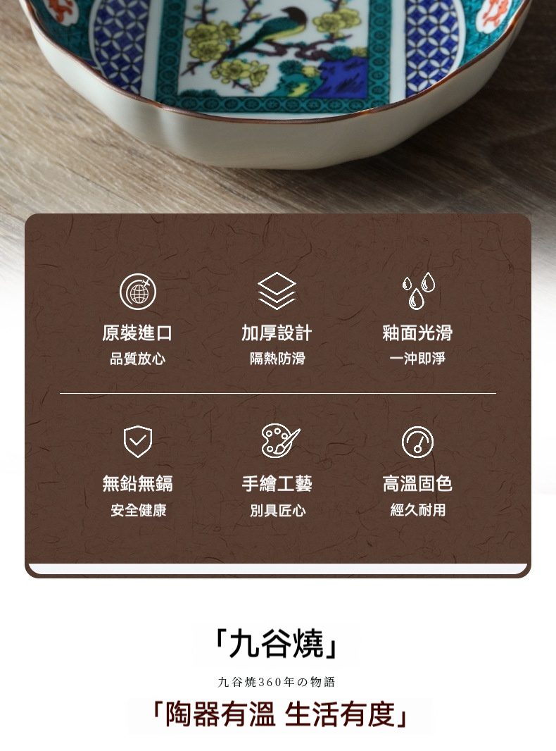 這只九谷燒煮物缽的品質遠超預期。首先是那種古九谷特有的厚重釉彩,色彩鮮麗濃郁,卻又帶著一種沉穩的質感,完全不是市面上廉價貼花瓷器能比擬的。梅雀圖案的線條自由奔放,裝飾性極強,隨意擺放幾道家常菜,看起來都像高級會席料理。缽體本身的燒製工藝很扎實,厚度適中,保溫效果也比一般盤子好,非常適合放熱食。包裝非常細心,收到時完整無損。整體來說,是一次非常令人滿意的購物體驗,推薦給重視餐桌美學的朋友們。