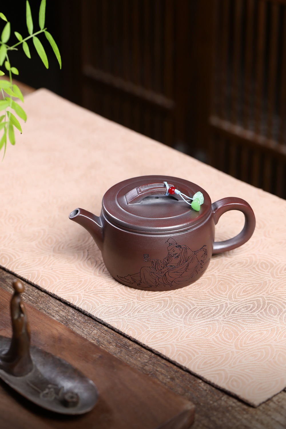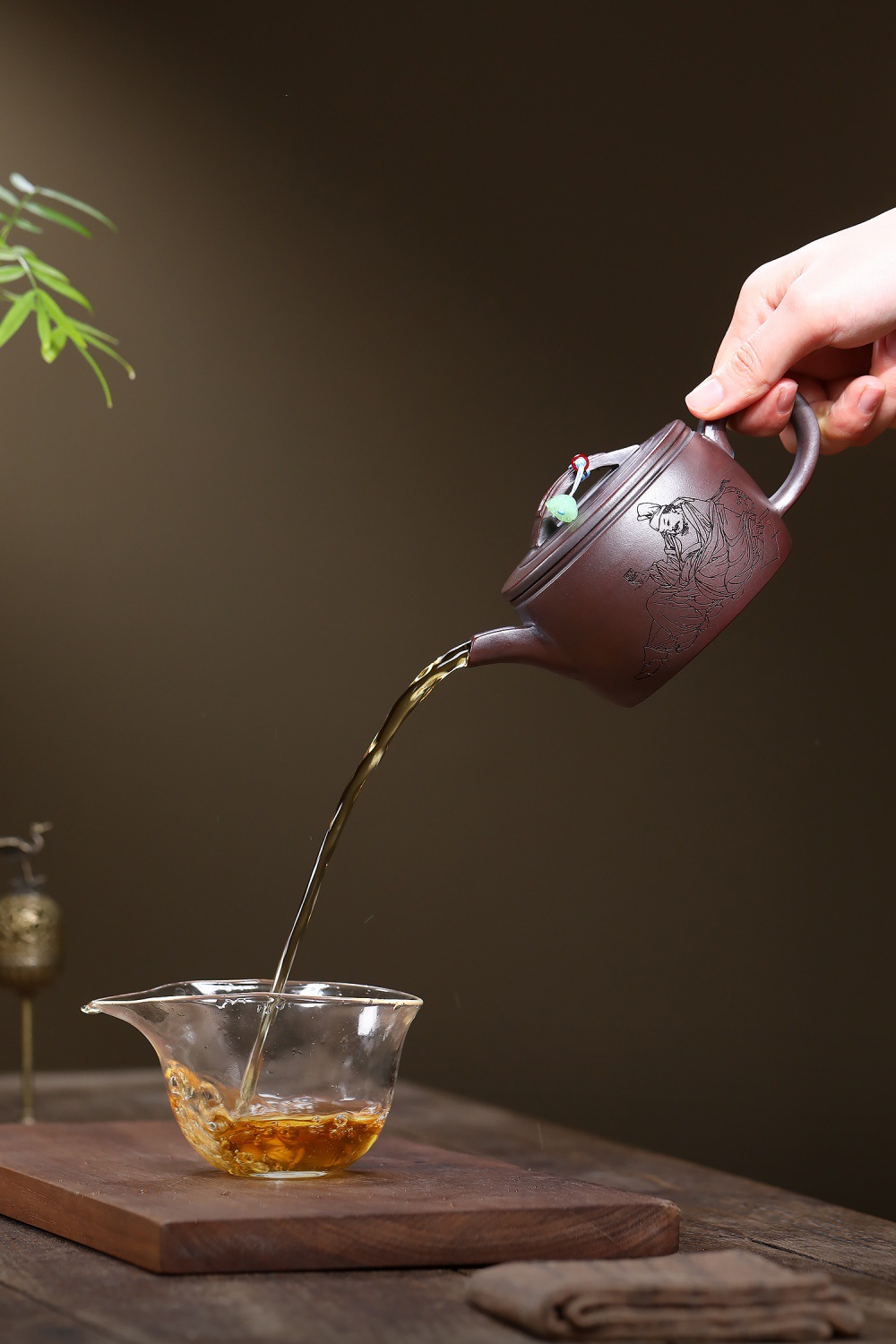 【泥料特性】砂土氣重,似淳實農民,日久使用,漸露鋒芒,養成變化溫潤莊重。紫砂是一種雙重氣孔結構的多孔性材質,氣孔微細,密度高。用紫砂壺沏茶,不失原味,且香不渙散,得茶之真香真味。紫砂使用越久,壺身色澤越發光亮照人。