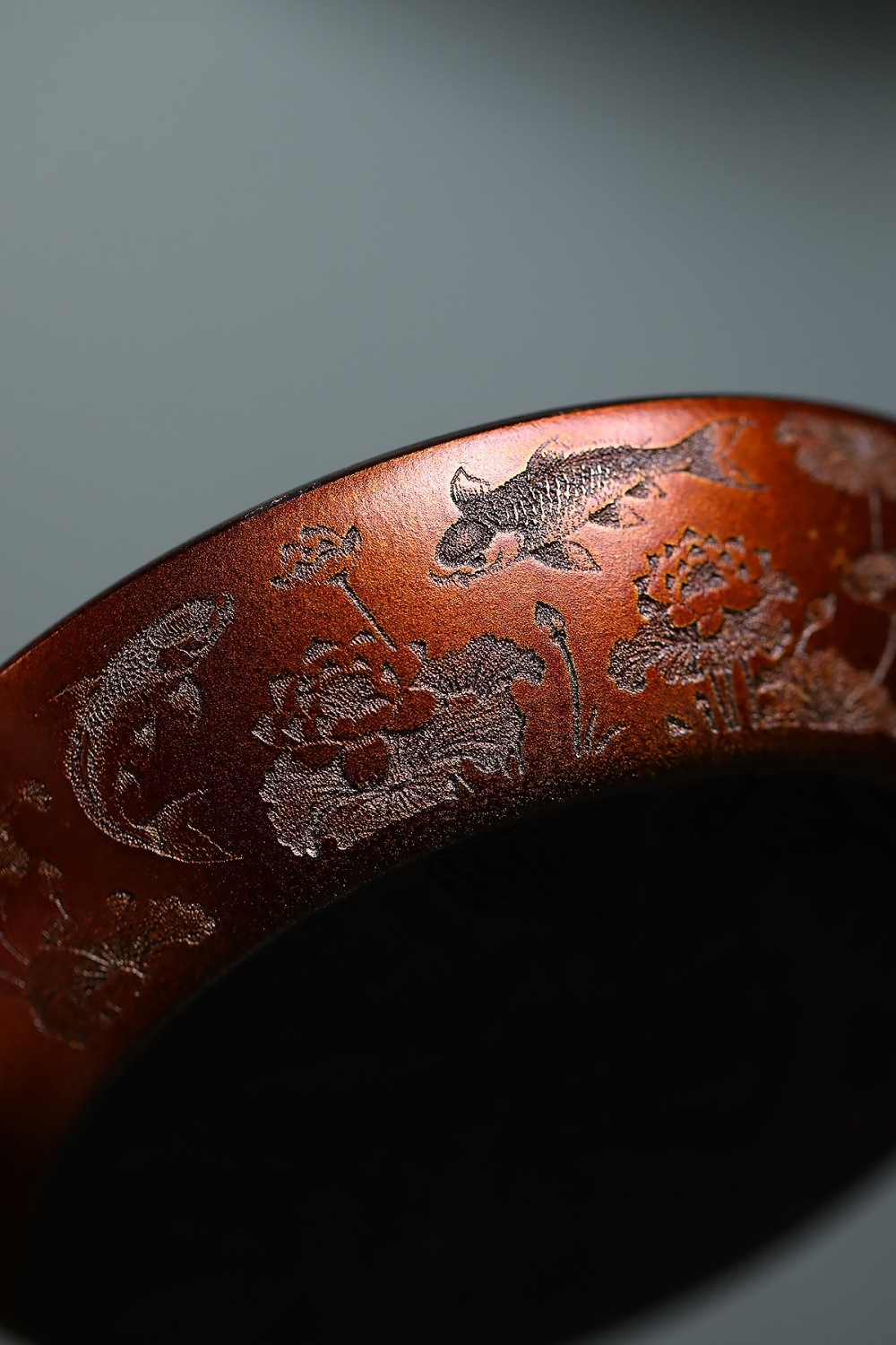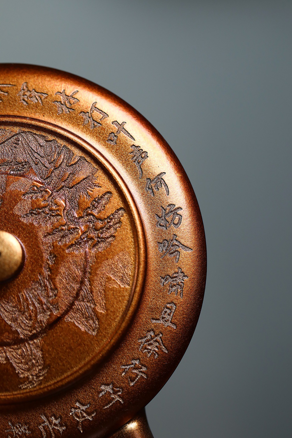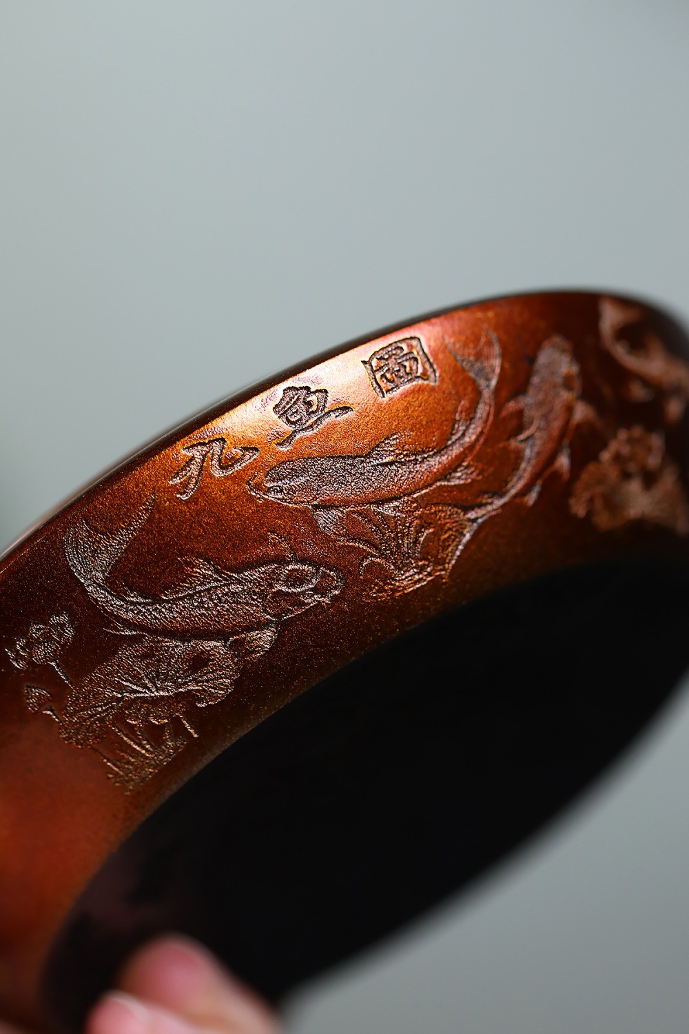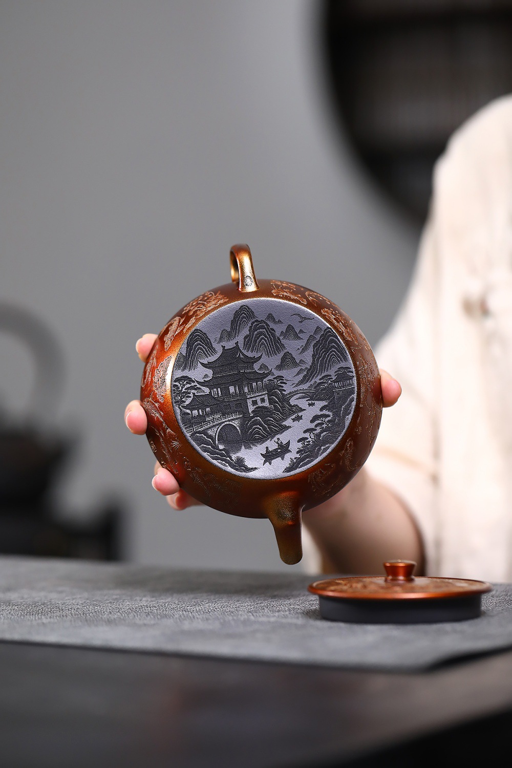 【作品介紹】 這是一把在傳統基礎上融入現代審美與工藝創新的石黃泥紫砂壺。其最引人注目的特點在於壺身與貝殼燒的裝飾技法,並結合了內推球孔的實用設計,以及一幅完整的九魚圖刻繪,使得整把壺既古雅溫潤,又熠熠生輝,堪稱實用性與藝術性的完美結合。