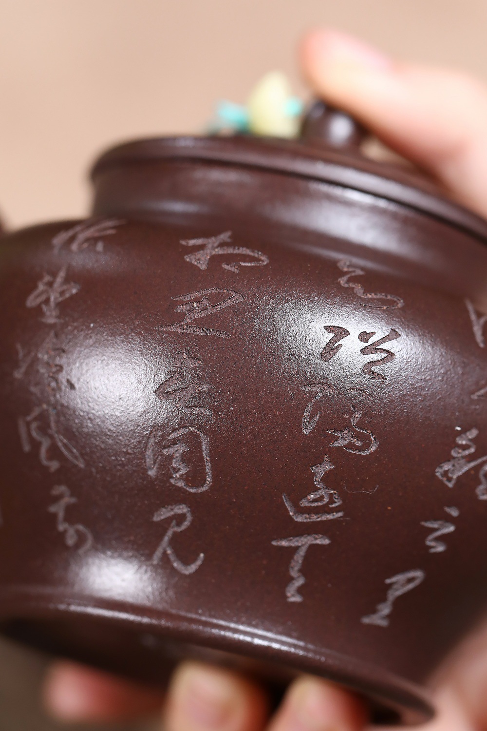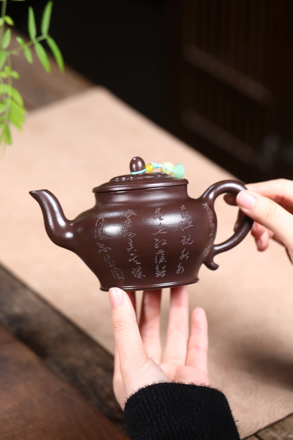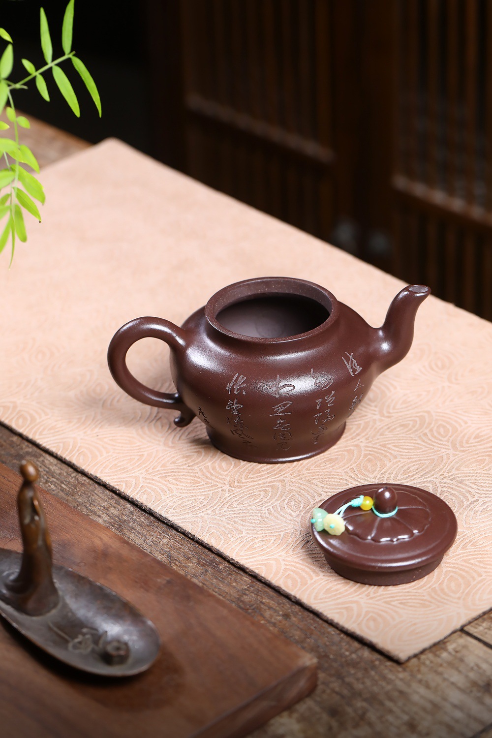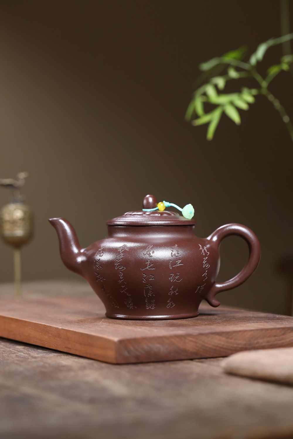 【泥料特性】砂土氣重,似淳實農民,日久使用,漸露鋒芒,養成變化溫潤莊重。紫砂是一種雙重氣孔結構的多孔性材質,氣孔微細,密度高。用紫砂壺沏茶,不失原味,且香不渙散,得茶之真香真味。紫砂使用越久,壺身色澤越發光亮照人。