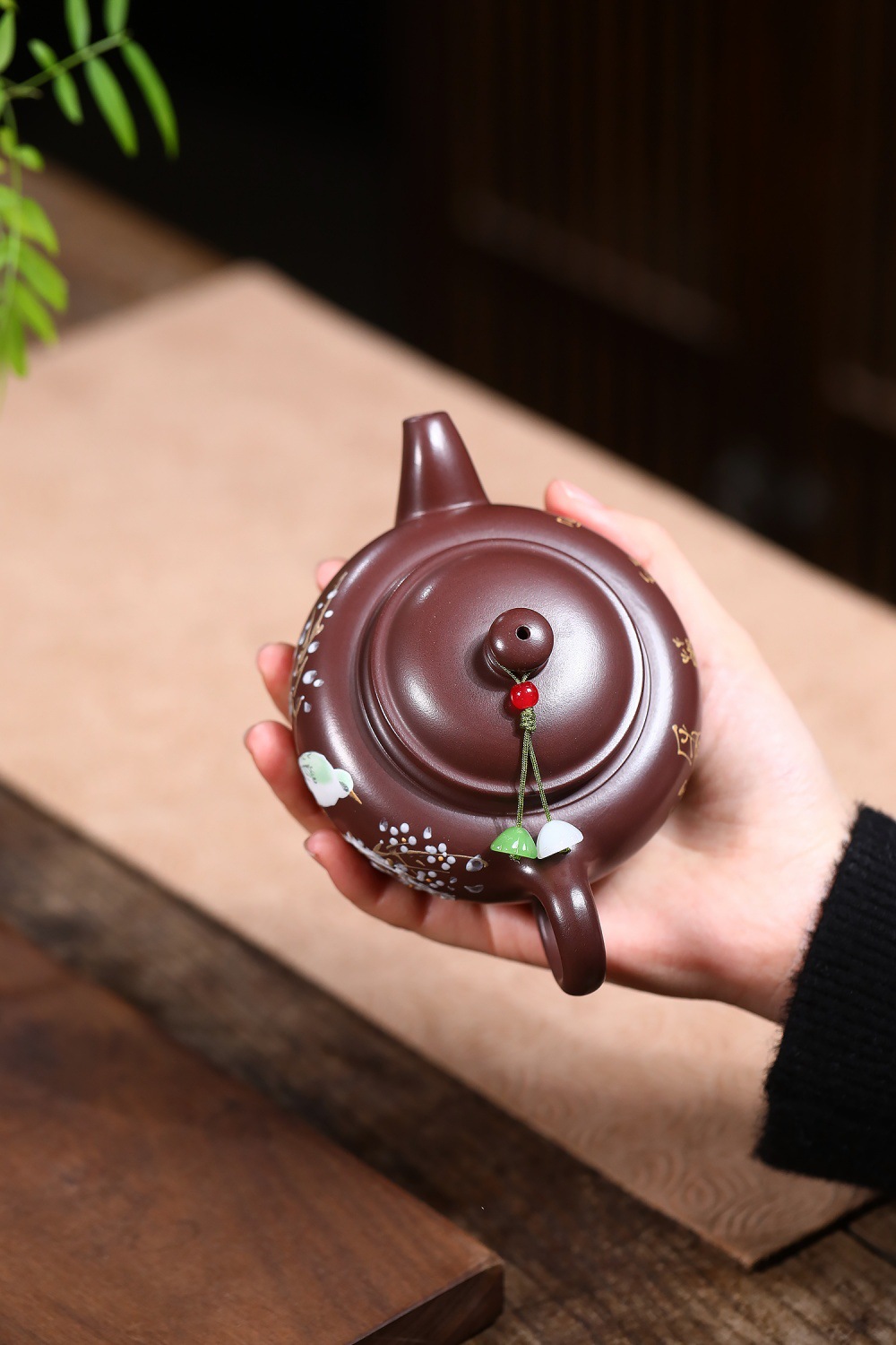 【泥料特性】砂土氣重,似淳實農民,日久使用,漸露鋒芒,養成變化溫潤莊重。紫砂是一種雙重氣孔結構的多孔性材質,氣孔微細,密度高。用紫砂壺沏茶,不失原味,且香不渙散,得茶之真香真味。紫砂使用越久,壺身色澤越發光亮照人。