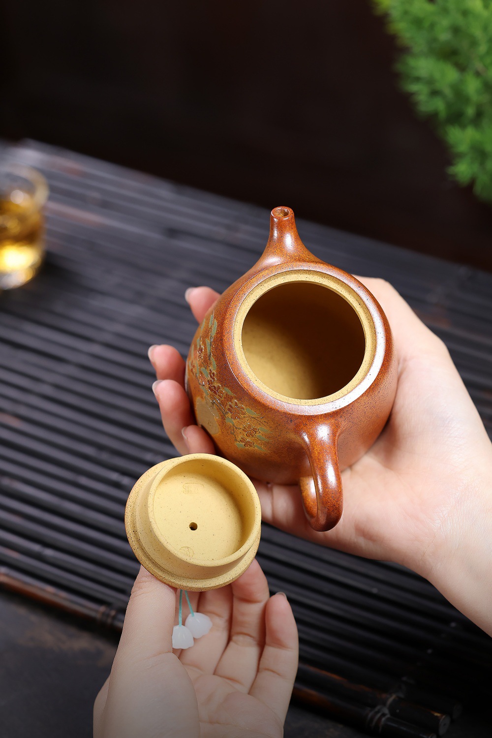 【泥料特性】砂土氣重,似淳實農民,日久使用,漸露鋒芒,養成變化溫潤莊重。紫砂是一種雙重氣孔結構的多孔性材質,氣孔微細,密度高。用紫砂壺沏茶,不失原味,且香不渙散,得茶之真香真味。紫砂使用越久,壺身色澤越發光亮照人。