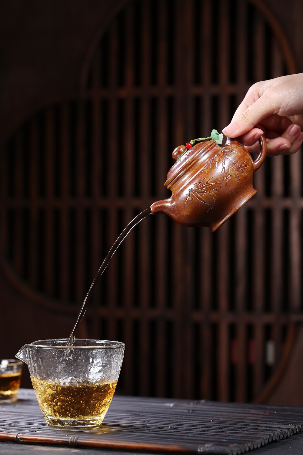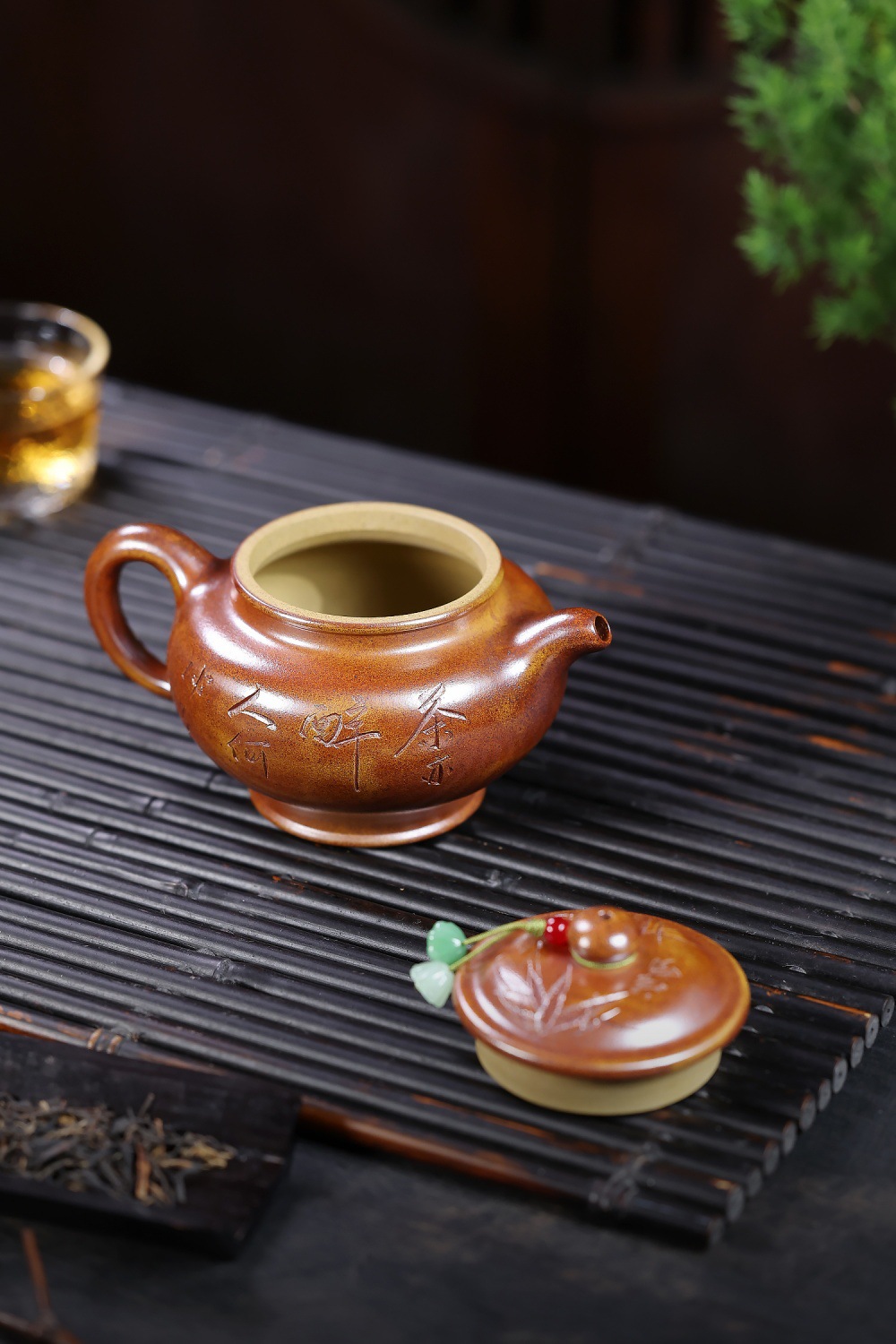 【泥料特性】砂土氣重,似淳實農民,日久使用,漸露鋒芒,養成變化溫潤莊重。紫砂是一種雙重氣孔結構的多孔性材質,氣孔微細,密度高。用紫砂壺沏茶,不失原味,且香不渙散,得茶之真香真味。紫砂使用越久,壺身色澤越發光亮照人。