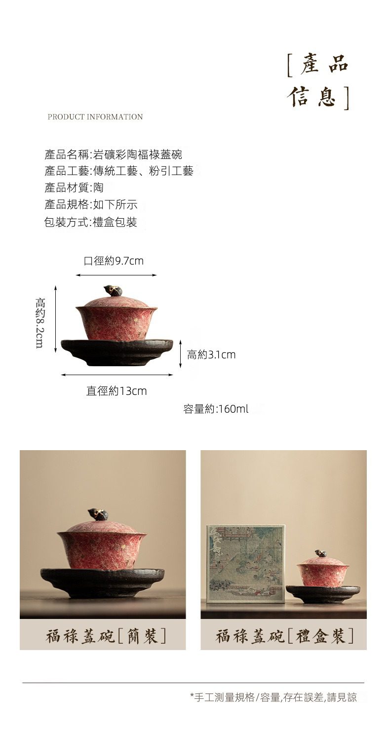 | 規格 | 岩礦彩陶福祿蓋碗(簡裝), 岩礦彩陶福祿蓋碗(禮盒裝) |