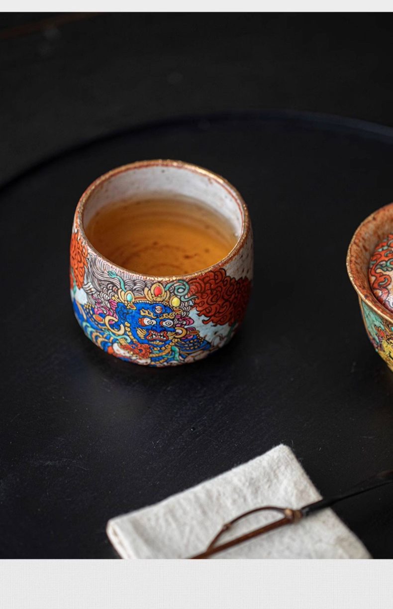 這款黑財神茶杯的釉色搭配得非常有韻味,遠看沉穩,近看又有細緻的紋路。杯子的整體平衡感極好,放在茶盤上相當穩固。志野燒的材質帶有一種獨特的溫潤觸感,讓人在飲茶時能自然地慢下節奏,去感受茶湯的溫度。手繪的黑財神圖案栩栩如生,線條流暢而不失莊重。整套茶席擺設下來,因為有了它而顯得格外有格調。對於喜歡陶藝或茶文化的人來說,這款杯子絕對是一件既耐看又實用的藝術品,非常值得收藏。
