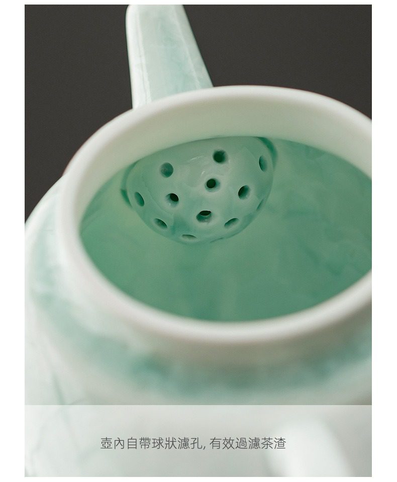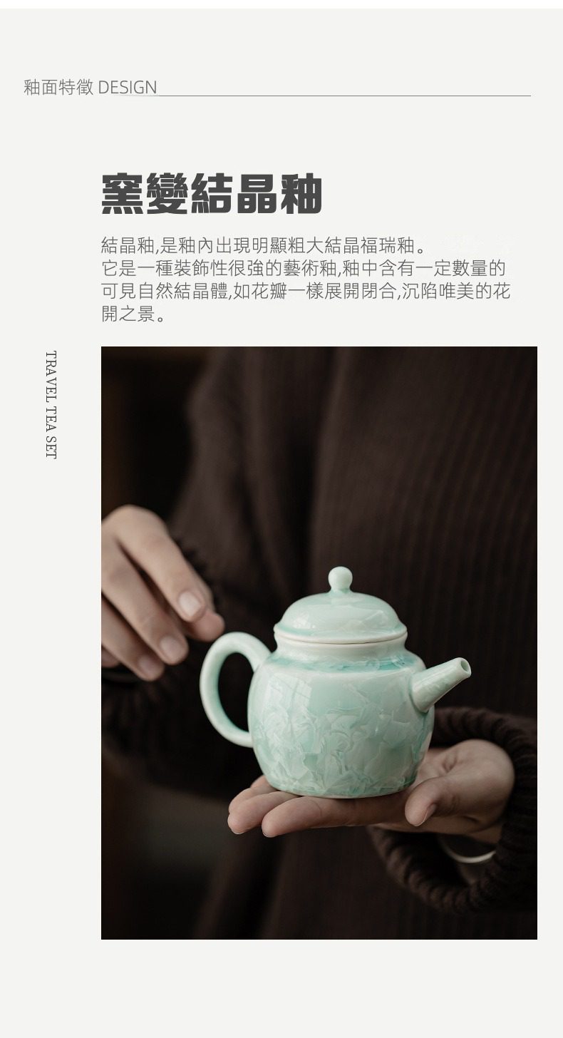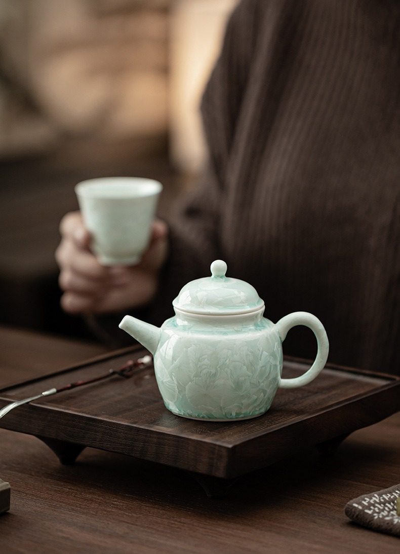 窯變結晶青綠龍旦壺採用稀有結晶釉技術燒製,器身表面於高溫還原環境中自然生成冰晶般花紋,讓每件壺體皆如結霜之景,獨具自然風韻。茶壺整體造型圓潤飽滿,壺嘴短粗有力,出水流暢穩定;壺蓋圓珠設計更添古典氣息與便利操作。
