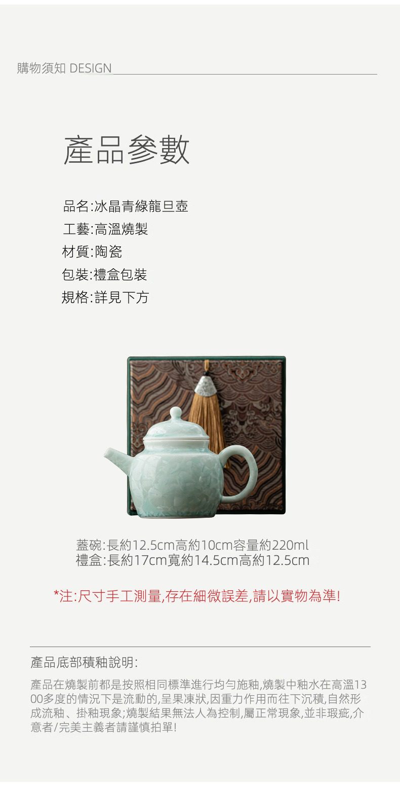 | 規格 | 冰晶青綠龍旦壺, 冰晶青綠龍旦壺(禮盒) |