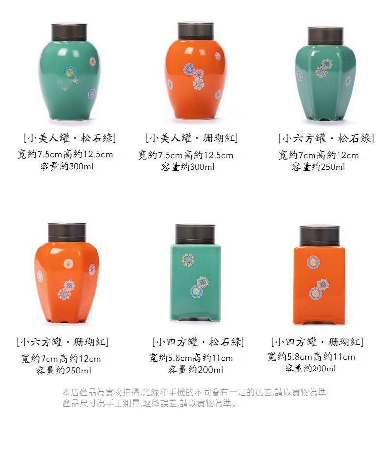 | 顏色分類 | 小美人茶葉罐(松石綠), 小美人茶葉罐(珊瑚紅), 小六方茶葉罐(松石綠), 小六方茶葉罐(珊瑚紅), 小四方茶葉罐(松石綠), 小四方茶葉罐(珊瑚紅) |
