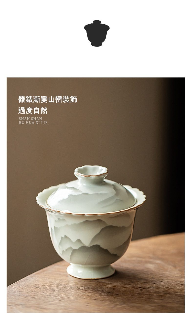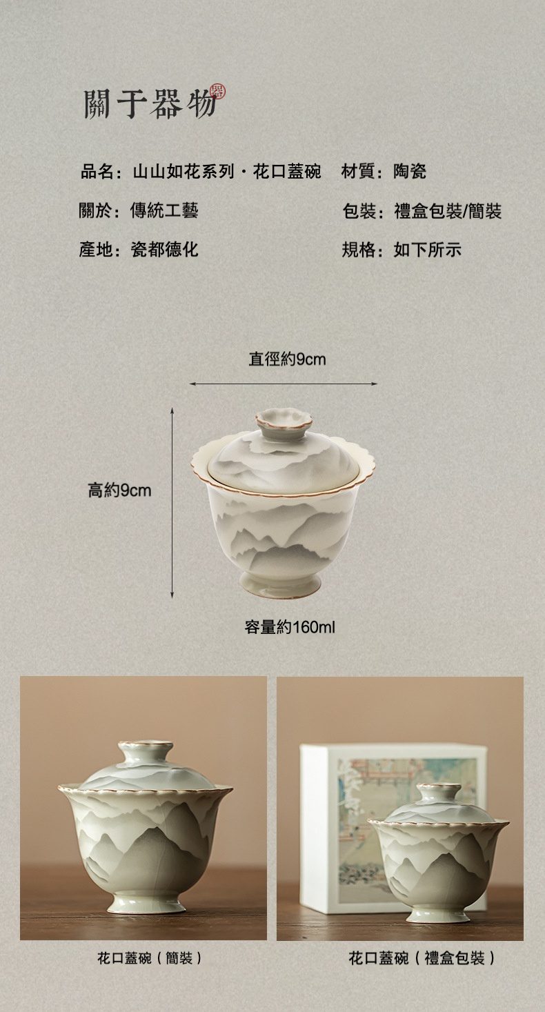 | 規格 | 仿古汝窯山山如花 – 蓋碗 ( 簡裝 ), 仿古汝窯山山如花 – 蓋碗 ( 禮盒裝 ) |