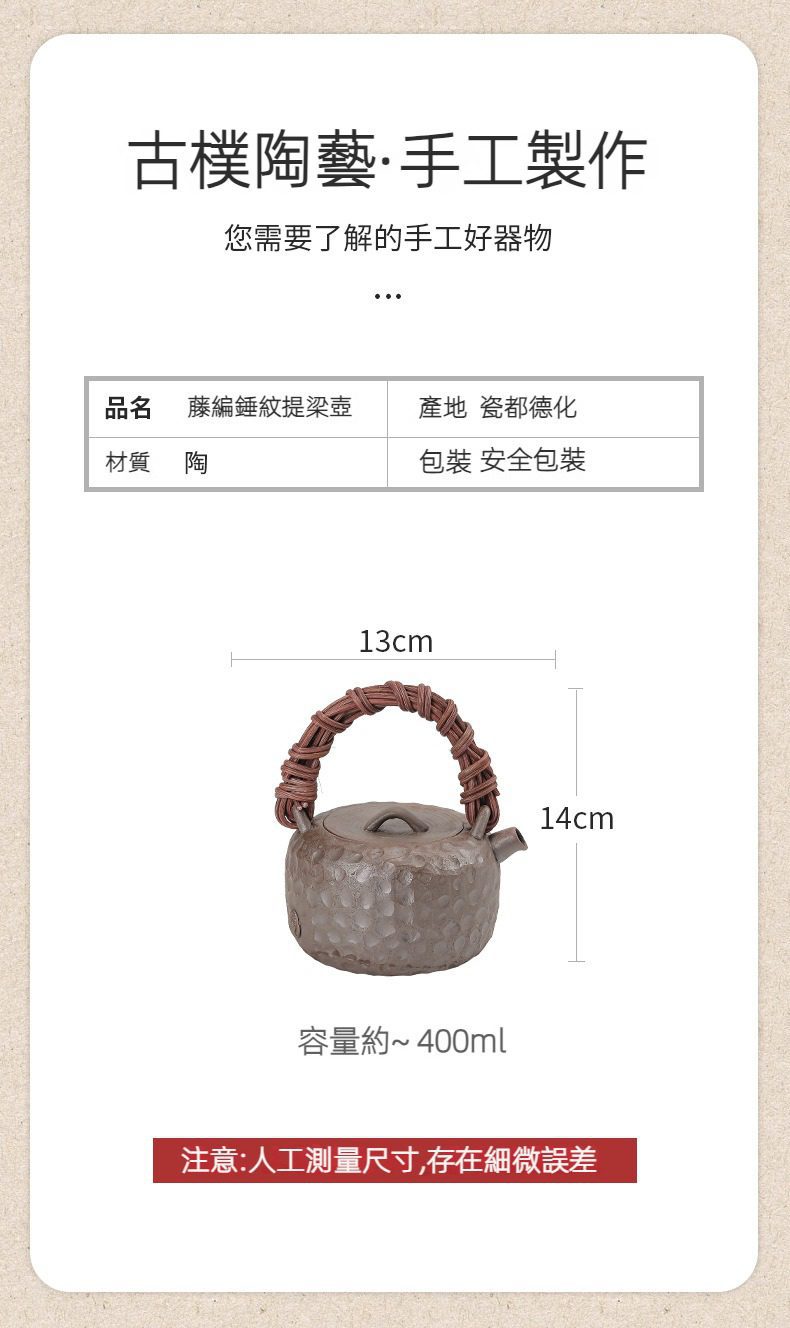 古早燒藤编錘紋提樑壺選用高品質材質,耐用易清潔,造型考究且穩定更加有序整潔,增添生活儀式感與格調,滿足自用、送禮與收藏需求。古早燒藤编錘紋提樑壺皆嚴選材質與職人工藝,展現實用性與審美兼具的體驗。即日起滿三件享9折、五件享85折,立即選購,為生活添上南山居的儀式感。