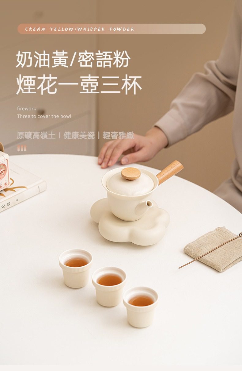 奶油風煙花一壺三杯茶具套組選用高品質材質,耐用易清潔,造型考究且穩定更加有序整潔,增添生活儀式感與格調,滿足自用、送禮與收藏需求。奶油風煙花一壺三杯茶具套組皆嚴選材質與職人工藝,展現實用性與審美兼具的體驗。即日起滿三件享9折、五件享85折,立即選購,為生活添上南山居的儀式感。