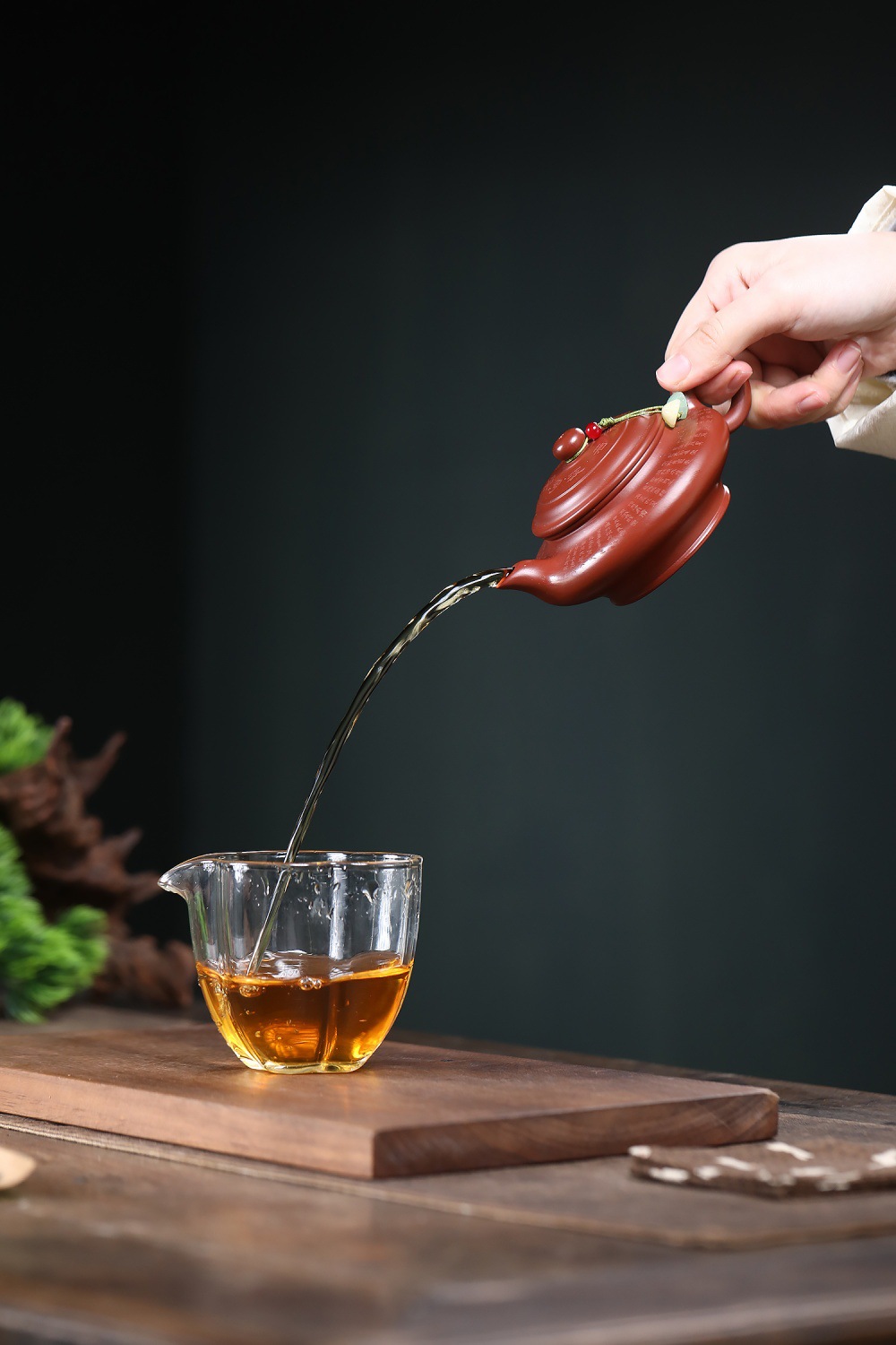 【泥料特性】砂土氣重,似淳實農民,日久使用,漸露鋒芒,養成變化溫潤莊重。紫砂是一種雙重氣孔結構的多孔性材質,氣孔微細,密度高。用紫砂壺沏茶,不失原味,且香不渙散,得茶之真香真味。紫砂使用越久,壺身色澤越發光亮照人。