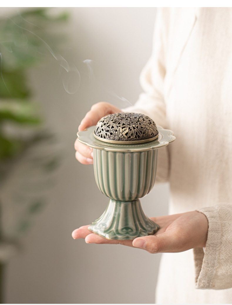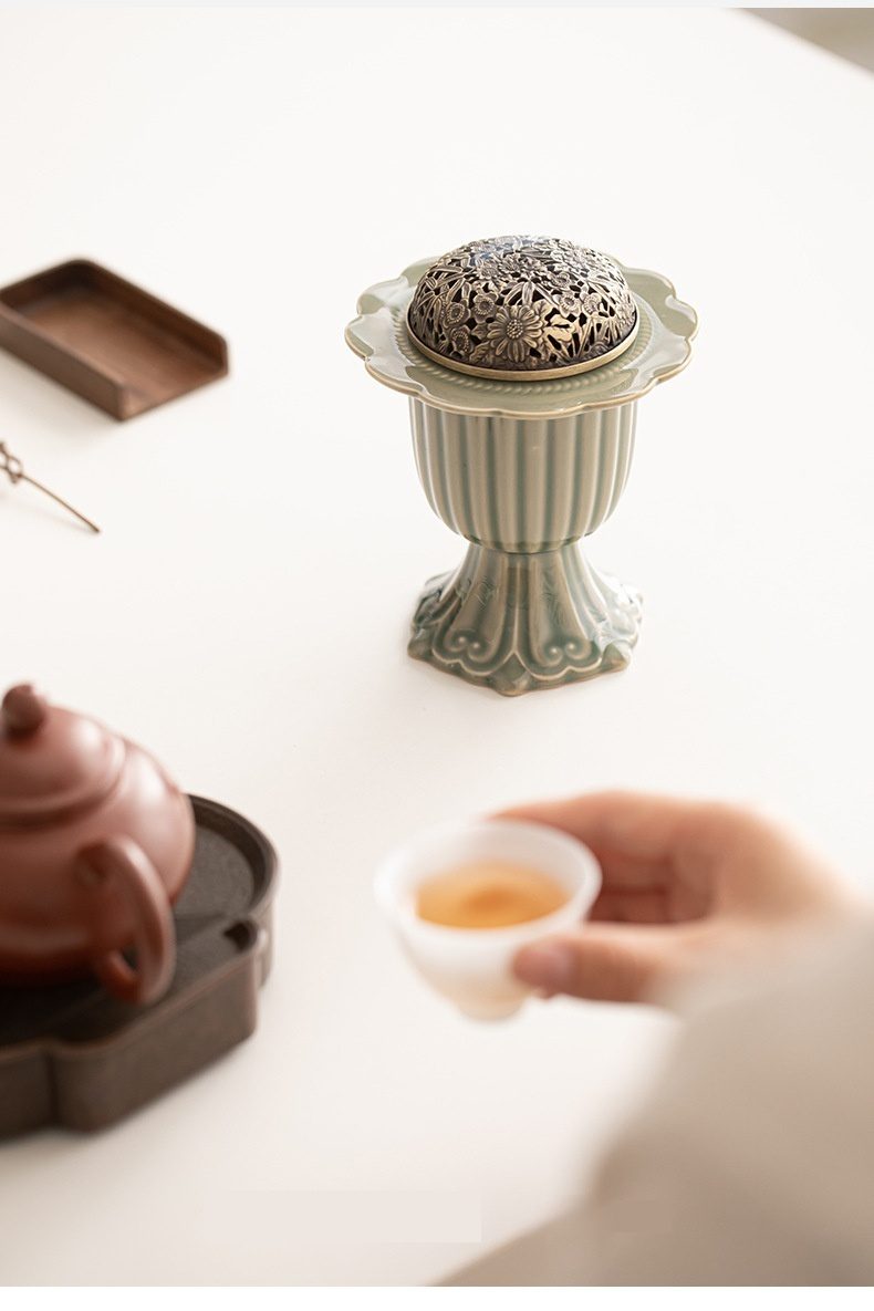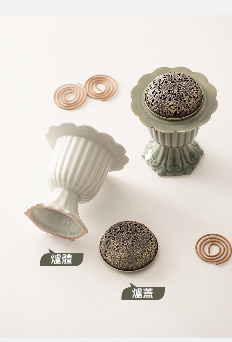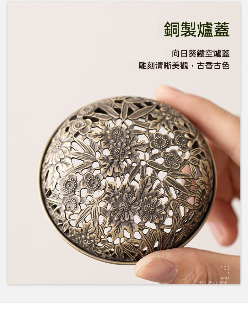 蓋頂以手工雕花銅蓋搭配鏤空設計,不僅提升通風助燃功能,更讓香煙從花紋間緩緩逸出,創造禪意詩境。