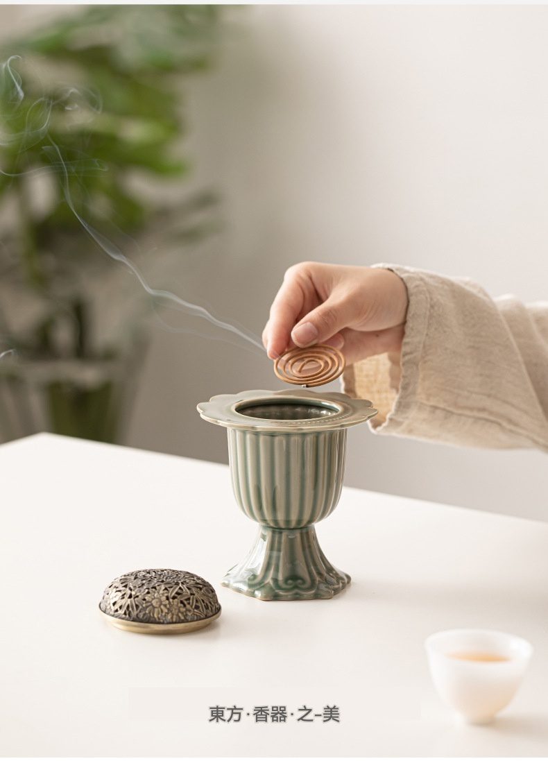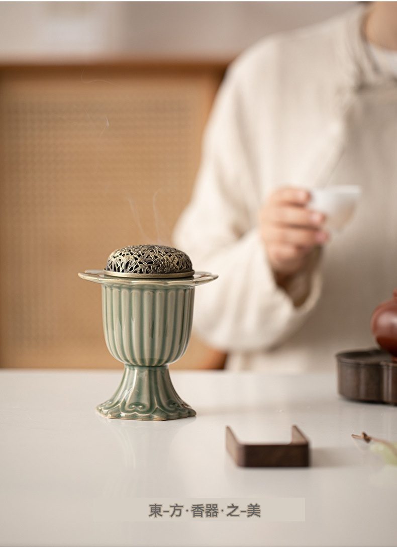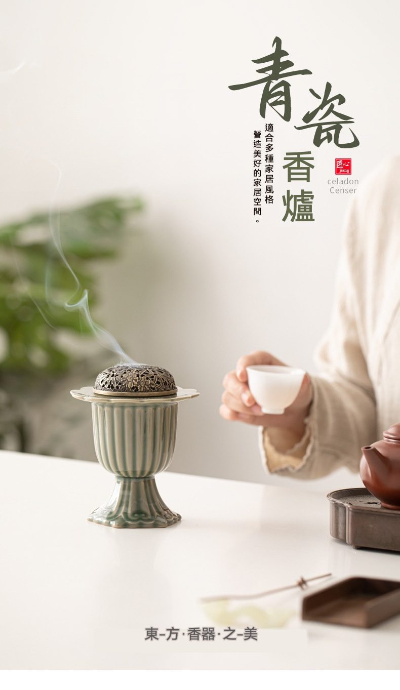 蓋頂以手工雕花銅蓋搭配鏤空設計,不僅提升通風助燃功能,更讓香煙從花紋間緩緩逸出,創造禪意詩境。