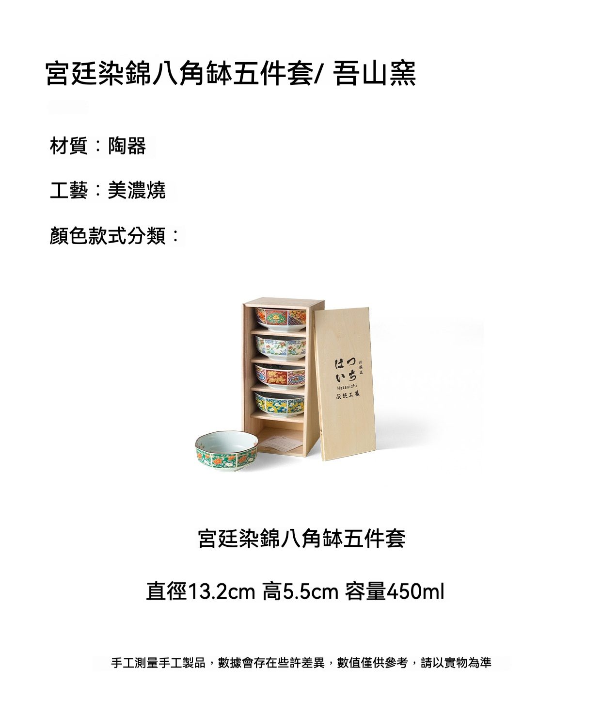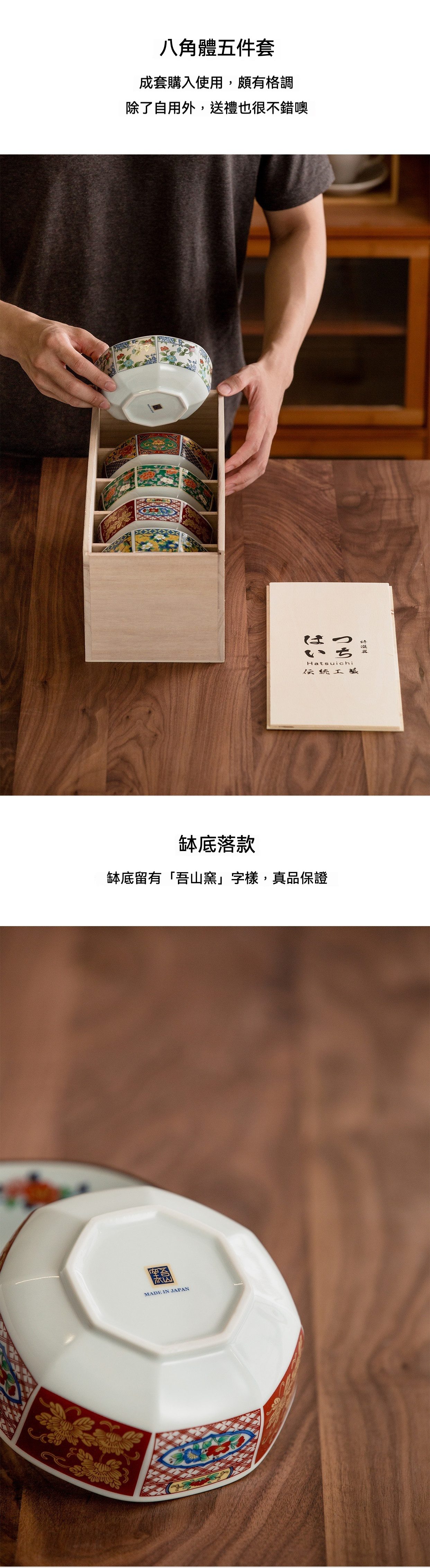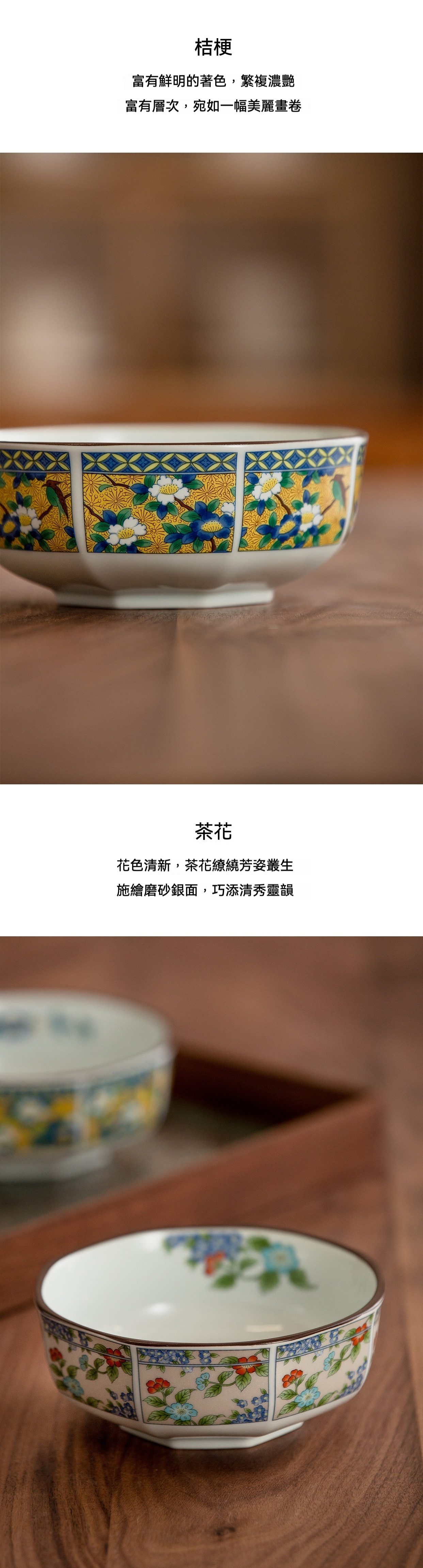 本系列宮廷染錦八角飯缽五件套,正是美濃燒傳統與華美設計的完美融合。每只碗皆採用細緻瓷胎製成,並由職人以染錦手法描繪牡丹、茶花、菊花等宮廷花卉,結合八角形寓意吉祥,展現濃厚東洋氣韻。