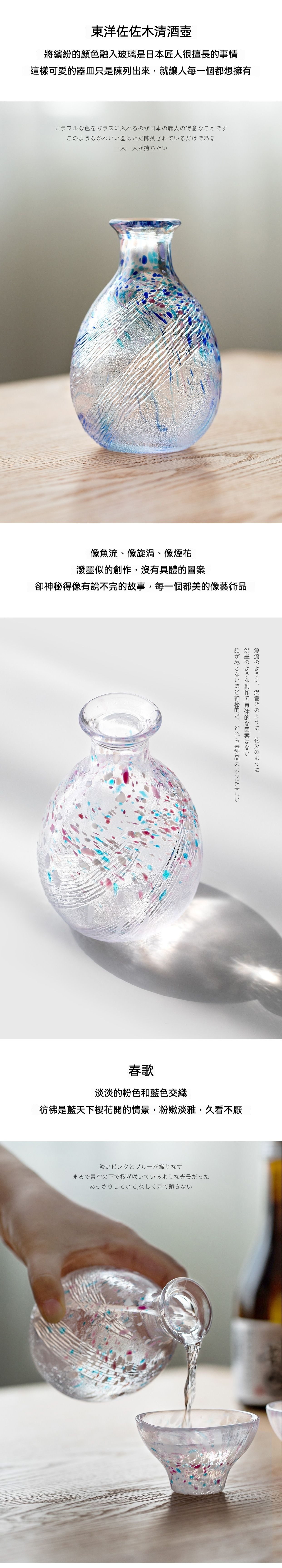 來自日本百年玻璃品牌 TOYO-SASAKI GLASS,此系列酒壺以自然為靈感,融合手工玻璃與色彩玻璃工藝,呈現四種繽紛主題:春歌、晴空、碧彩、清池。壺身線條如流水般環繞,搭配如彩花般的斑點彩釉,每一只皆為匠人手工製作,獨一無二。無論冷酒或清酒,皆能感受來自日式生活的美學與儀式感。