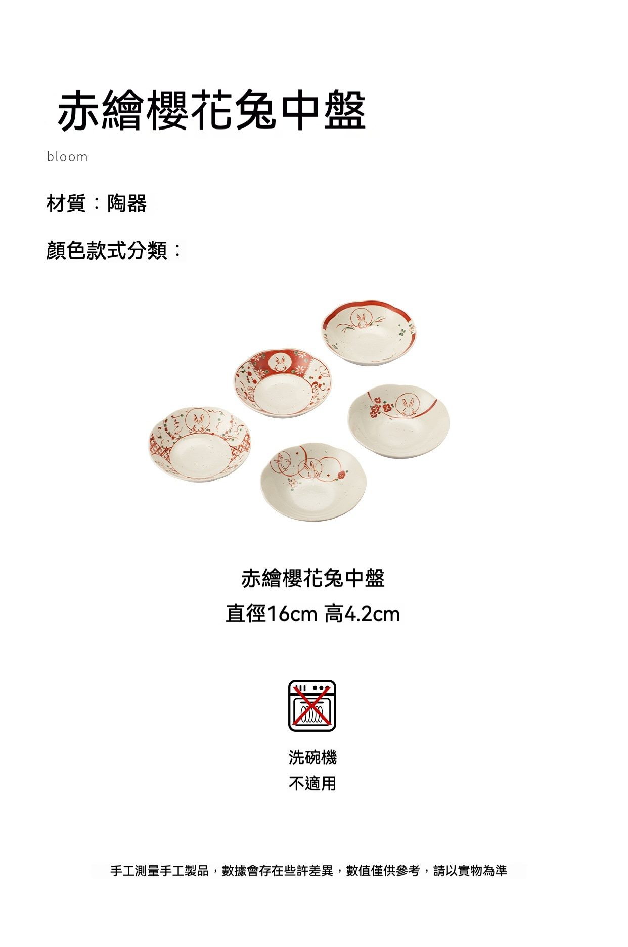 以日本傳統赤繪技法為基礎,結合可愛櫻花兔圖案,展現四季花鳥與和風童趣之美。每款套組包含五只圖樣各異的小碟、小盤或碗,採用日本美濃燒製法,釉色柔和溫潤,筆觸精緻,適合擺放點心、醬料、配菜或作為裝飾器皿。
