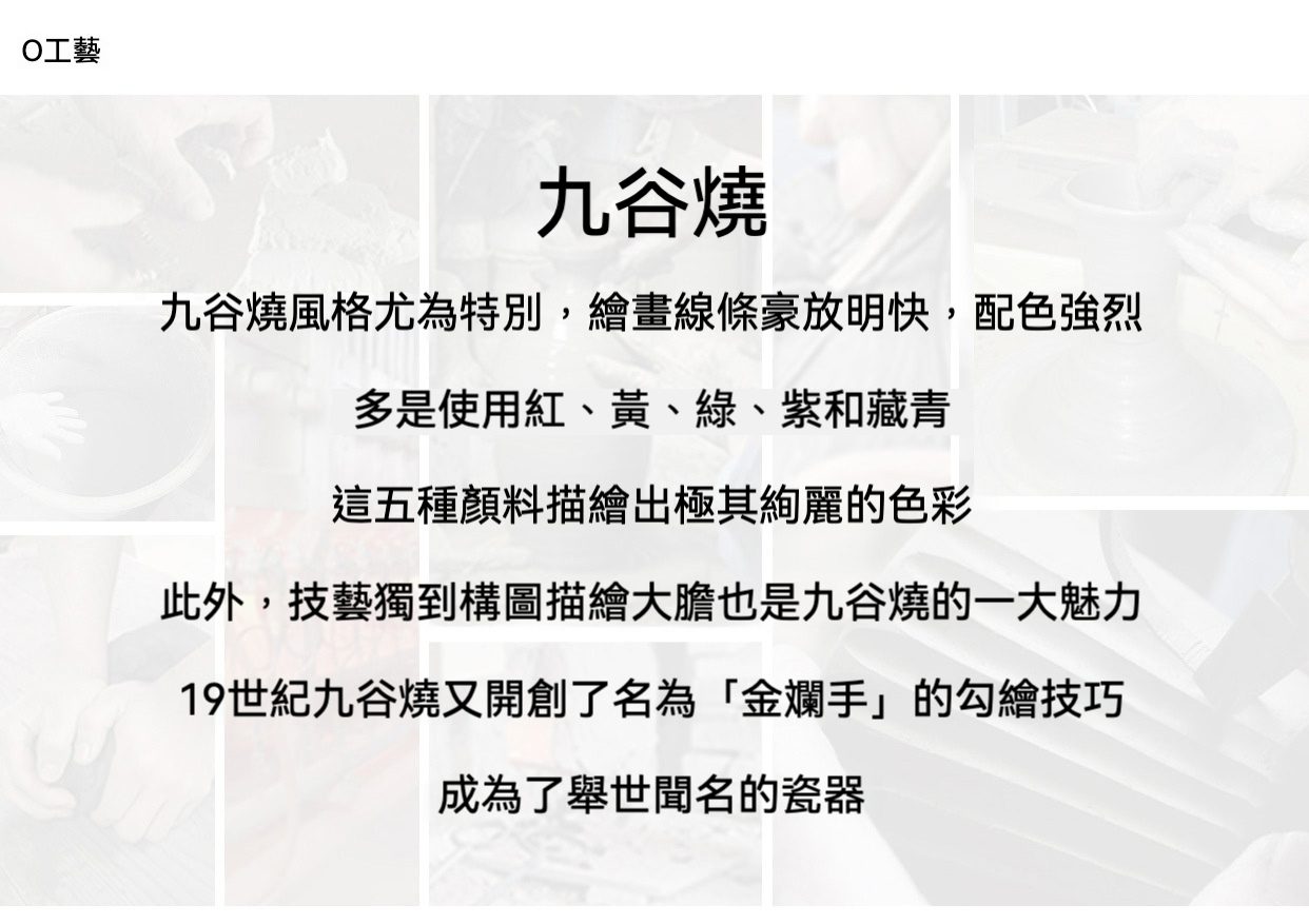 九谷燒為日本石川縣加賀地區所發源的傳統陶瓷,自江戶時代(約17世紀中葉)起便以「五彩繽紛的絢爛畫風」聞名於世。其最大的特色為:在細緻的瓷胎上施以鮮明濃烈的紅、藍、黃、綠、紫五彩釉彩,並融合金箔或金線描繪,成就出豪華華麗的視覺風格。