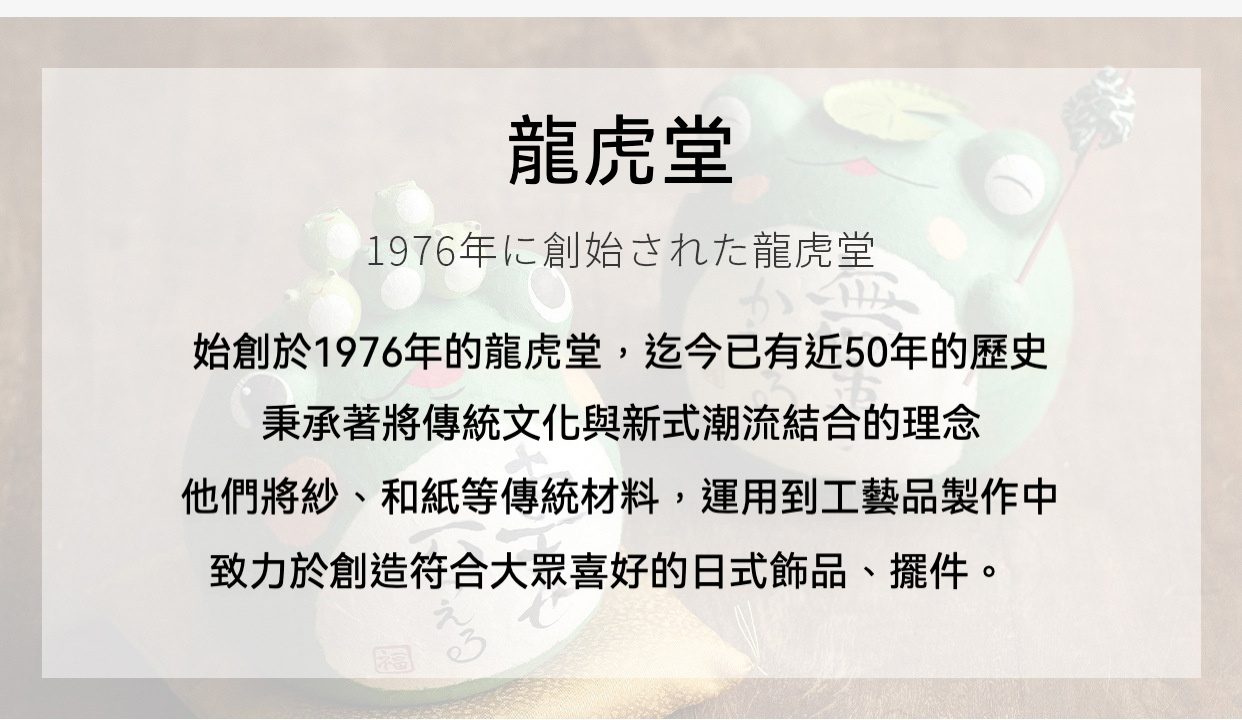 成立背景:龍虎堂(Ryukodo / 龍虎堂)是日本知名的生活雜貨與工藝品牌,主要生產各式各樣的 招財貓、吉祥小物、和風陶藝、室內擺飾。