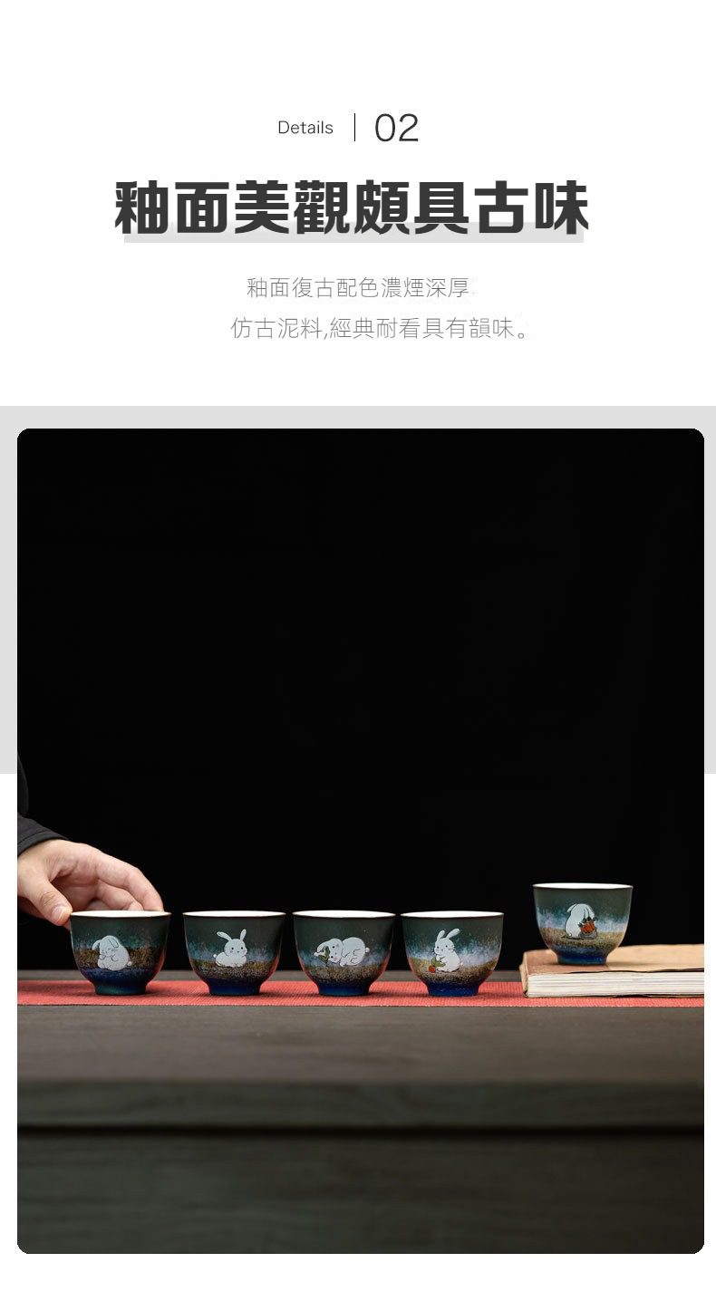 窯變煥彩五兔豐盈品茗杯套組選用高品質材質,耐用易清潔,造型考究且穩定更加有序整潔,增添生活儀式感與格調,滿足自用、送禮與收藏需求。窯變煥彩五兔豐盈品茗杯套組皆嚴選材質與職人工藝,展現實用性與審美兼具的體驗。即日起滿三件享9折、五件享85折,立即選購,為生活添上南山居的儀式感。