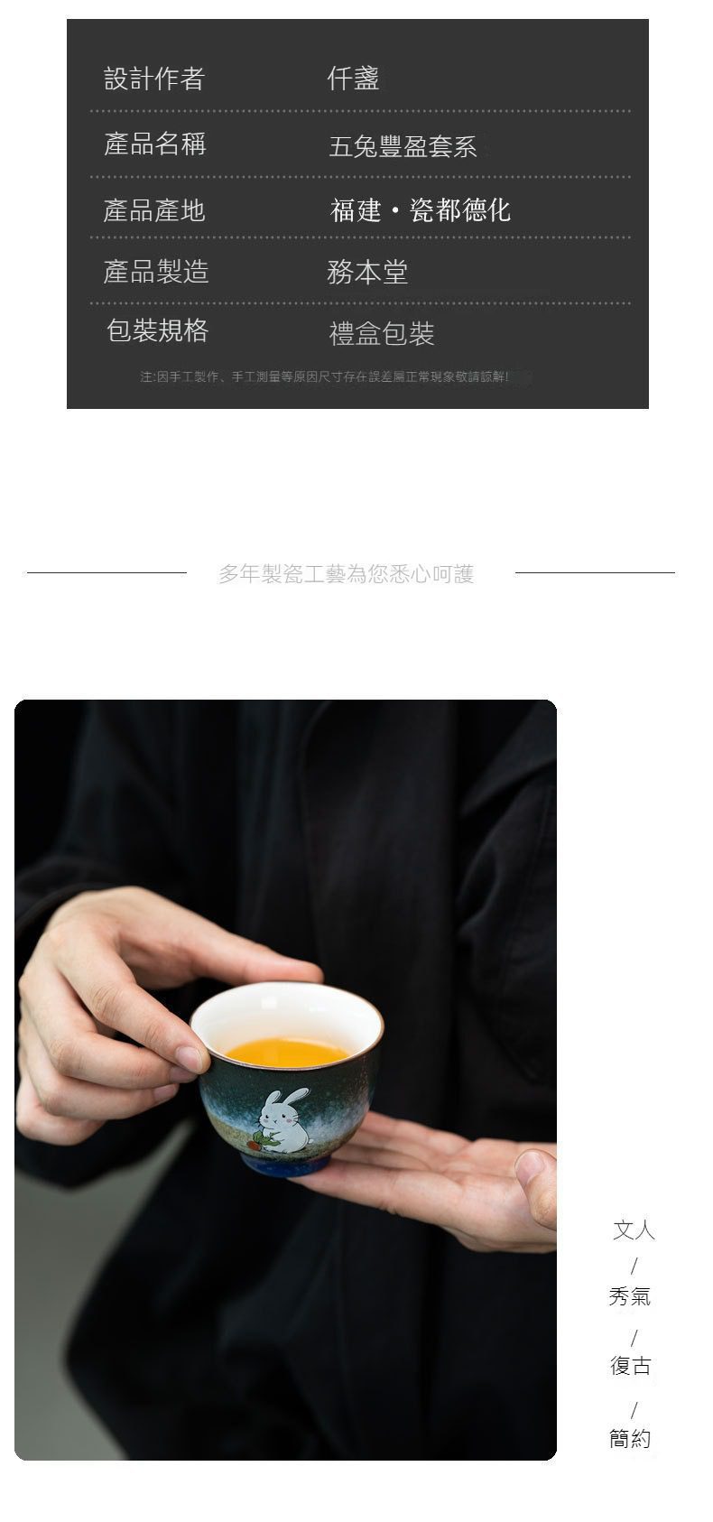 窯變煥彩伍兔豐盈品茗杯選用高品質材質,耐用易清潔,造型考究且穩定更加有序整潔,增添生活儀式感與格調,滿足自用、送禮與收藏需求。窯變煥彩伍兔豐盈品茗杯皆嚴選材質與職人工藝,展現實用性與審美兼具的體驗。即日起滿三件享9折、五件享85折,立即選購,為生活添上南山居的儀式感。