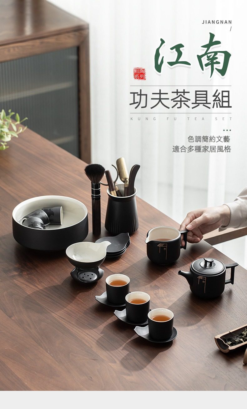 黑陶江南功夫茶具組選用高品質材質,耐用易清潔,造型考究且穩定更加有序整潔,增添生活儀式感與格調,滿足自用、送禮與收藏需求。黑陶江南功夫茶具組皆嚴選材質與職人工藝,展現實用性與審美兼具的體驗。即日起滿三件享9折、五件享85折,立即選購,為生活添上南山居的儀式感。