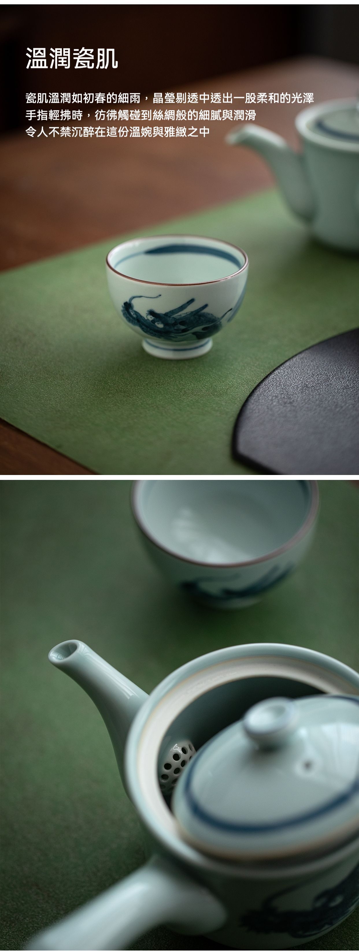 以 青花龍紋 等祥瑞題材聞名,筆觸大膽奔放,常見於酒器、茶具與食器。
