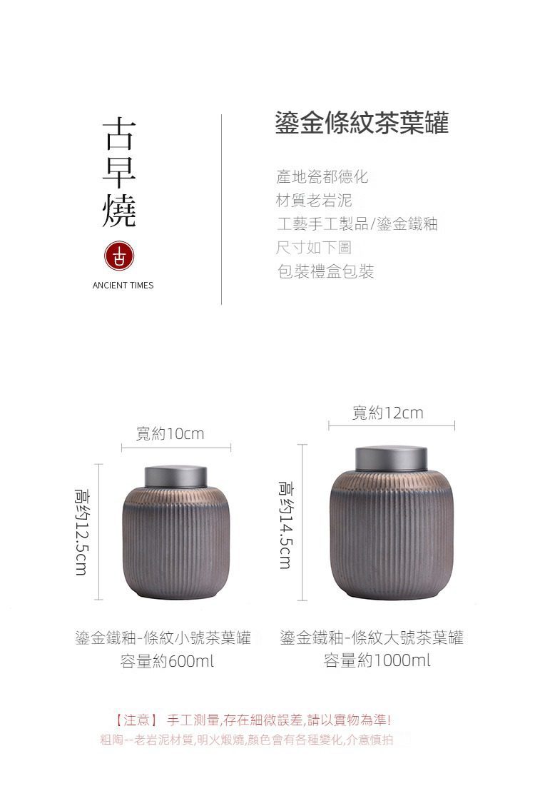古早燒鎏金條紋茶葉罐選用高品質材質,耐用易清潔,造型考究且穩定更加有序整潔,增添生活儀式感與格調,滿足自用、送禮與收藏需求。古早燒鎏金條紋茶葉罐皆嚴選材質與職人工藝,展現實用性與審美兼具的體驗。即日起滿三件享9折、五件享85折,立即選購,為生活添上南山居的儀式感。