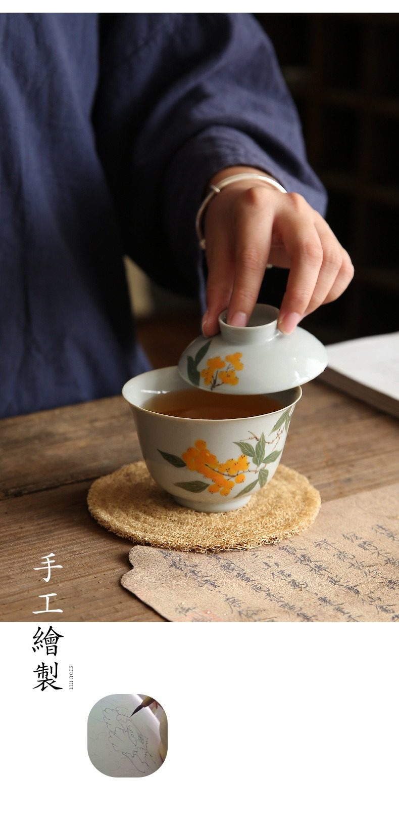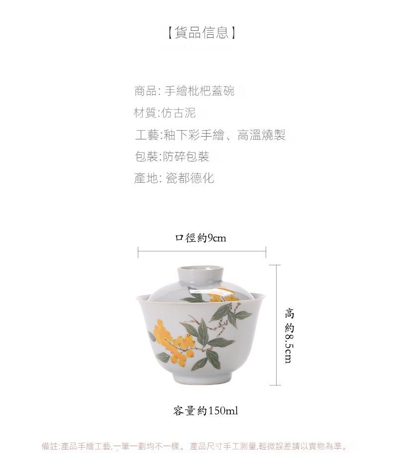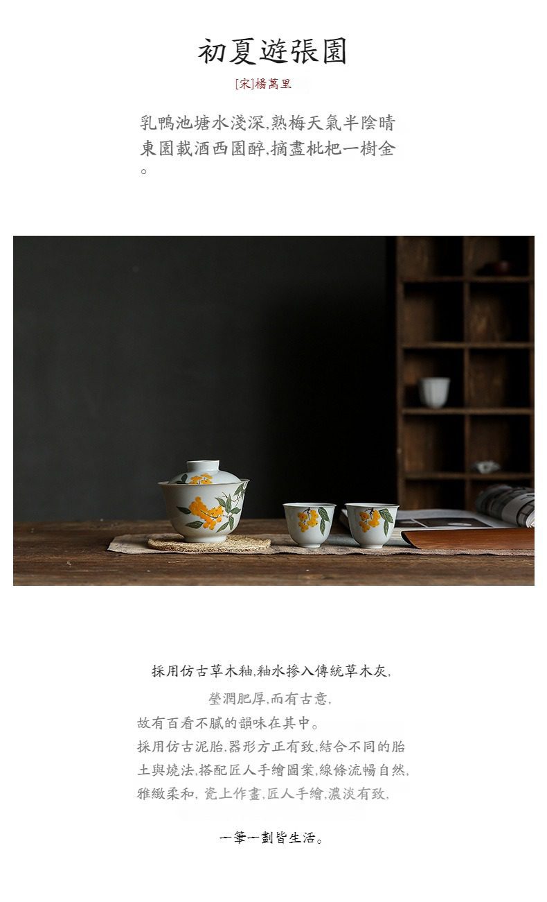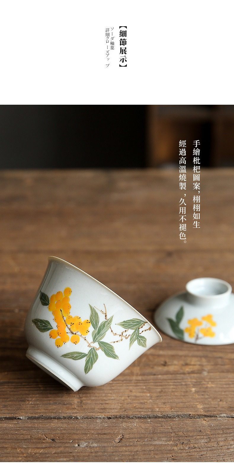 手繪枇杷蓋碗選用高品質材質,耐用易清潔,造型考究且穩定更加有序整潔,增添生活儀式感與格調,滿足自用、送禮與收藏需求。手繪枇杷蓋碗皆嚴選材質與職人工藝,展現實用性與審美兼具的體驗。即日起滿三件享9折、五件享85折,立即選購,為生活添上南山居的儀式感。