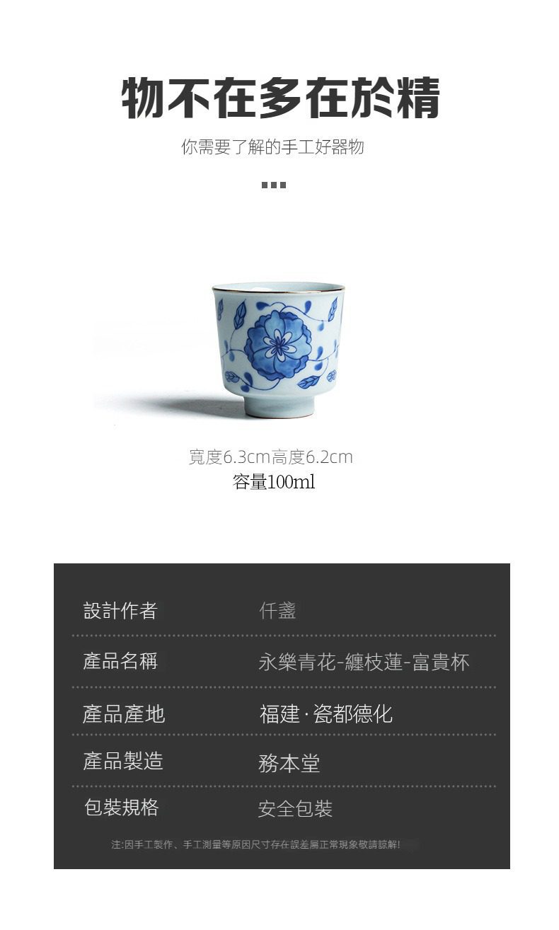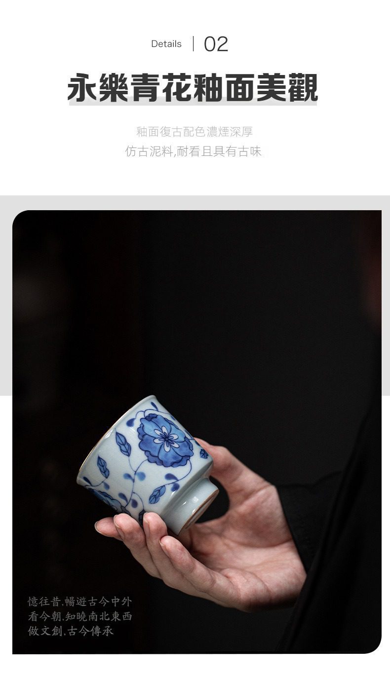 青花瓷永樂纏枝蓮富貴品茗杯選用高品質材質,耐用易清潔,造型考究且穩定更加有序整潔,增添生活儀式感與格調,滿足自用、送禮與收藏需求。青花瓷永樂纏枝蓮富貴品茗杯皆嚴選材質與職人工藝,展現實用性與審美兼具的體驗。即日起滿三件享9折、五件享85折,立即選購,為生活添上南山居的儀式感。