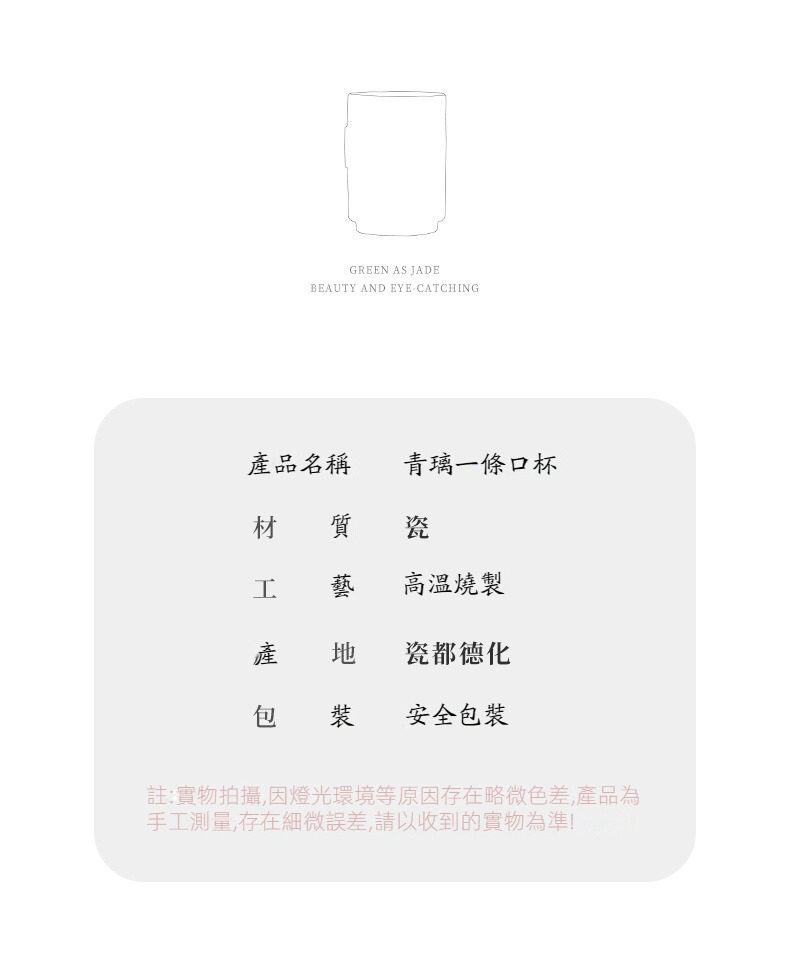 青璃釉一條口茶杯選用高品質材質,耐用易清潔,造型考究且穩定更加有序整潔,增添生活儀式感與格調,滿足自用、送禮與收藏需求。青璃釉一條口茶杯皆嚴選材質與職人工藝,展現實用性與審美兼具的體驗。即日起滿三件享9折、五件享85折,立即選購,為生活添上南山居的儀式感。