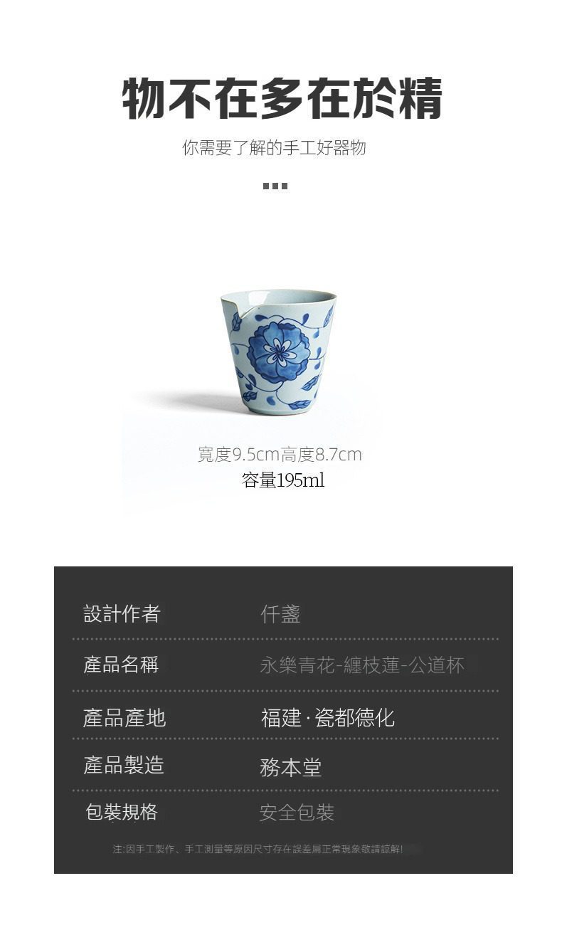 青花瓷永樂公道杯選用高品質材質,耐用易清潔,造型考究且穩定更加有序整潔,增添生活儀式感與格調,滿足自用、送禮與收藏需求。青花瓷永樂公道杯皆嚴選材質與職人工藝,展現實用性與審美兼具的體驗。即日起滿三件享9折、五件享85折,立即選購,為生活添上南山居的儀式感。
